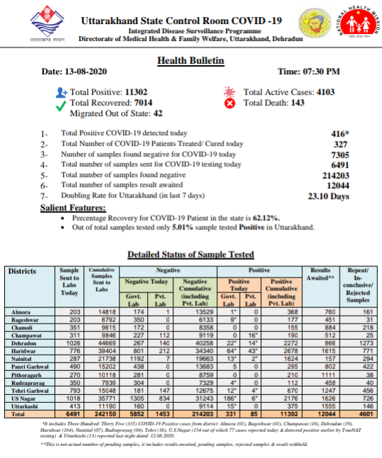 उत्तराखंड में कोरोना के मामले दिन प्रतिदिन बढ़ने से अब अस्पतालों में बेड का संकट गहरा सकता है कोरोना संक्रमण के मामले 11 हजारी होने से प्रदेश की जनता के साथ साथ शासन प्रशासन की चिंताएं बढ़ती जा रही हैं वही रोज संक्रमित मामले बढ़ने के साथ-साथ कंटेनमेंट जोन की संख्या भी बढ़ती जा रही है। आज स्वास्थ्य विभाग द्वारा जारी हेल्थ बुलेटिन के अनुसार प्रदेश में आज कोरोना संक्रमण के 416 मामले सामने आए है और एक्टिव मरीजो की संख्या 4103 हो गए है।