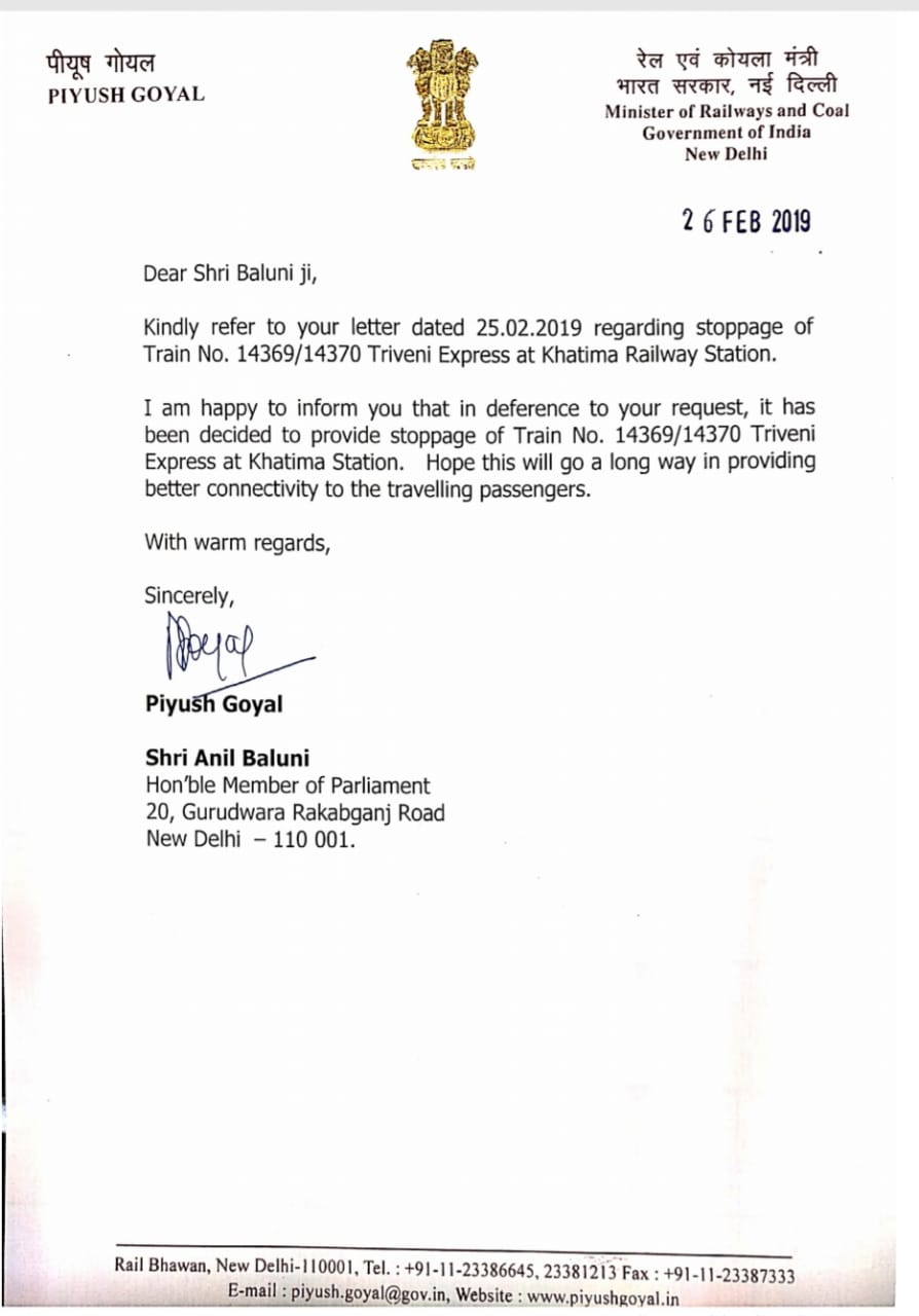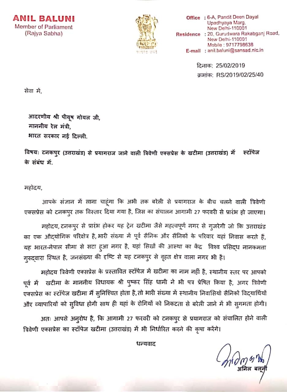 सांसद अनिल बलूनी ने अपनी त्वरित कार्यशैली व जनता की सुविधाओं व समस्याओं के लिए संवेदनशील रुख को दिखाते हुए रेल मंत्री पीयूष गोयल से मात्र 24 घण्टे में त्रिवेणी एक्सप्रेस को खटीमा में रुकने का पत्र जारी करवा सीमान्त जनता को सौगात देने का काम किया।गौरतलब है कि सीमान्त खटीमा जंहा एक ओर राज्य आंदोलन की प्रमुख भूमि रही वही सैनिक बाहुल्य व जनजाति क्षेत्र होने के बावजूद खटीमा स्टेशन को पहली बार शुरू हो रही त्रिवेणी एक्सप्रेस के खटीमा में स्टॉपेज ना मिलने से सीमान्त खटीमा की जनता आहत थी। साथ ही त्रिवेणी एक्सप्रेस के खटीमा में भी स्टॉपेज करवाने को लेकर पिछले कुछ दिनों से आंदोलनरत थी। लेकिन जब सीमान्त जनता की यह गुहार को सांसद अनिल बलूनी के पास पहुँची तो उन्होंने मात्र 24 घण्टे में खटीमा की जनता को त्रिवेणी एक्सप्रेस का स्टॉपेज दिलवा कर भाजपा की डबल इंजन की सरकार का दम भी दिखा दिया।