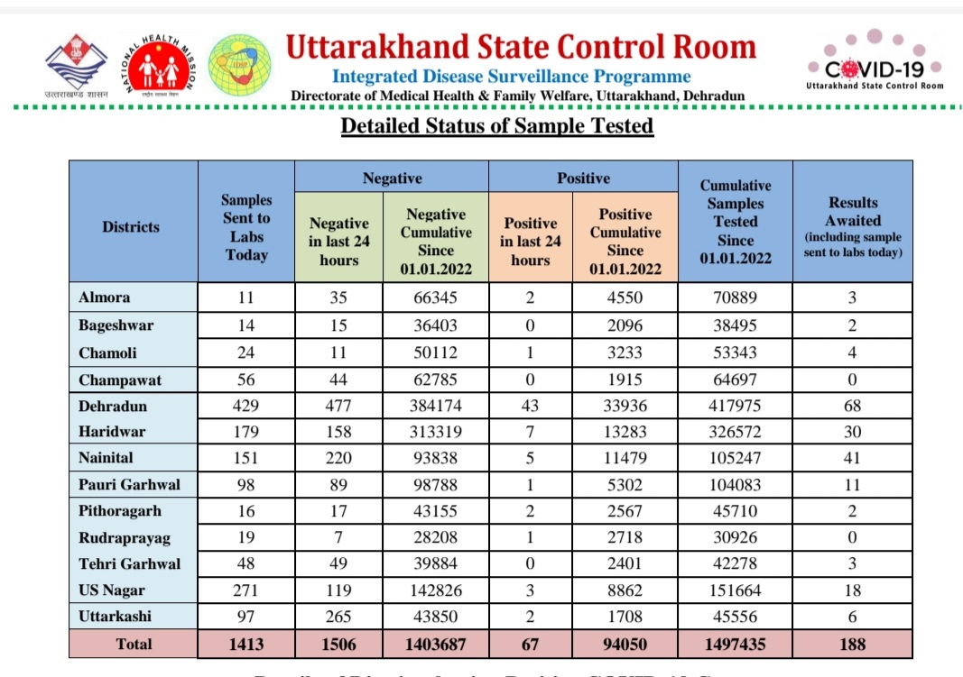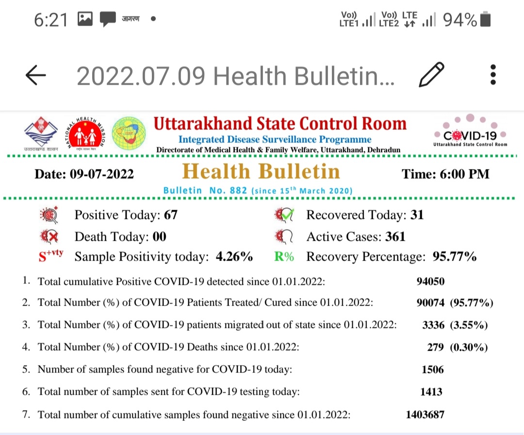 उत्तराखंड में शनिवार को स्वास्थ्य विभाग द्वारा जारी हेल्थ बुलेटिन के अनुसार 24 घंटे के भीतर कोरोना के 67 नए मरीज मिले हैं, जबकि 31 मरीज स्वस्थ हुए हैं. वहीं, 67 नये मरीज मिलने से अब एक्टिव केस की संख्या 361 हो गई है. प्रदेश में सैंपल पॉजिटिविटी रेट 4.26% है।
