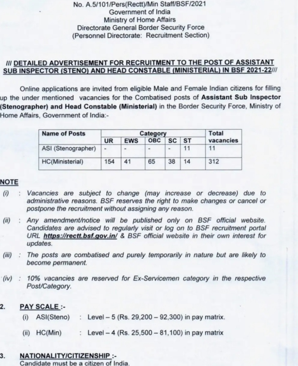 महानिदेशालय सीमा सुरक्षा बल ने एएसआई और हेड कांस्टेबल के 324 पदों पर योग्य और इच्छुक उमीदवारो से आवेदन मांगे है इच्छुक और योग्य उम्मीदवार इन पदों के लिए बीएसएफ की आधिकारिक साइट rectt.bsf.gov.in पर जाकार आवेदन कर सकते हैं. इस भर्ती के लिए पंजीकरण प्रक्रिया 8 अगस्त को शुरू हो गई है जो कि 6 सितंबर 2022 तक चलेगी. इस भर्ती हेड कॉन्स्टेबल के 312 पदों और एएसआई (स्टेनोग्राफर) के 11 पदों को भरा जाएगा