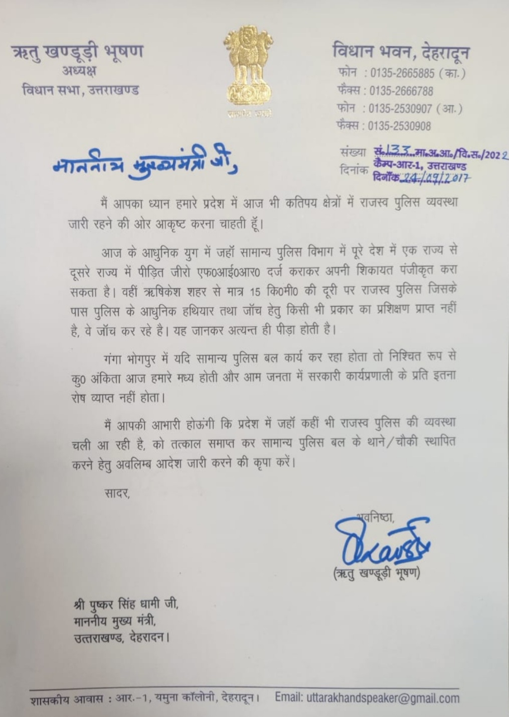 विधानसभा अध्यक्ष ने अपने पत्र में लिखा कि गंगा भोगपुर में यदि सामान्य पुलिस बल कार्य कर रहा होता तो निश्चित रूप से प्रदेश की बेटी अंकिता आज हमारे मध्य होती और आम जनता में सरकारी कार्यप्रणाली के प्रति इतना रोष व्याप्त नहीं होता। विधानसभा अध्यक्ष ने तत्काल प्रभाव में राजस्व पुलिस की व्यवस्था को समाप्त कर पुलिस चौकी एवं थाना स्थापित करने का मुख्यमंत्री से आग्रह किया, जिससे भविष्य में इस प्रकार की अप्रिय घटना दुबारा घटित न हो|