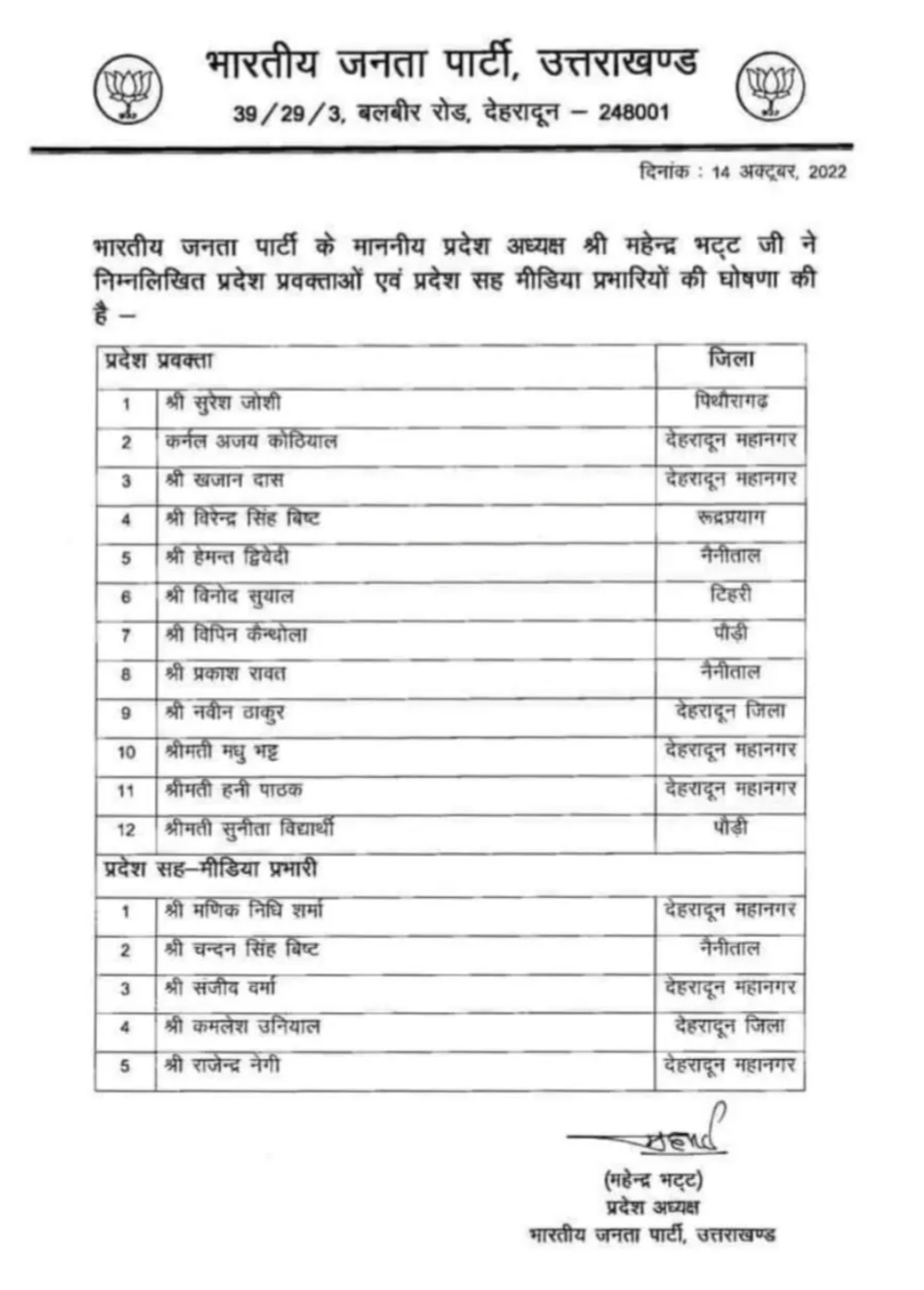 देहरादून – भारतीय जनता पार्टी के प्रदेश अध्यक्ष महेंद्र भट्ट के निर्देश पर 12 प्रदेश प्रवक्ता और 5 सह मीडिया प्रभारी बनाये गये है