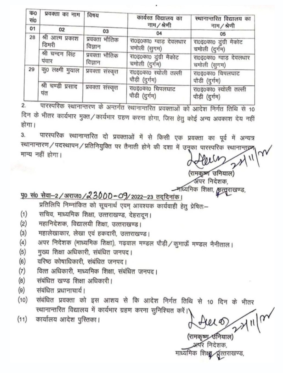 इस संबंध में उत्तराखंड माध्यमिक शिक्षा के अपर निदेशक रामकृष्ण उनियाल ने स्थानांतरण आदेश जारी किया है। आदेश के अनुसार