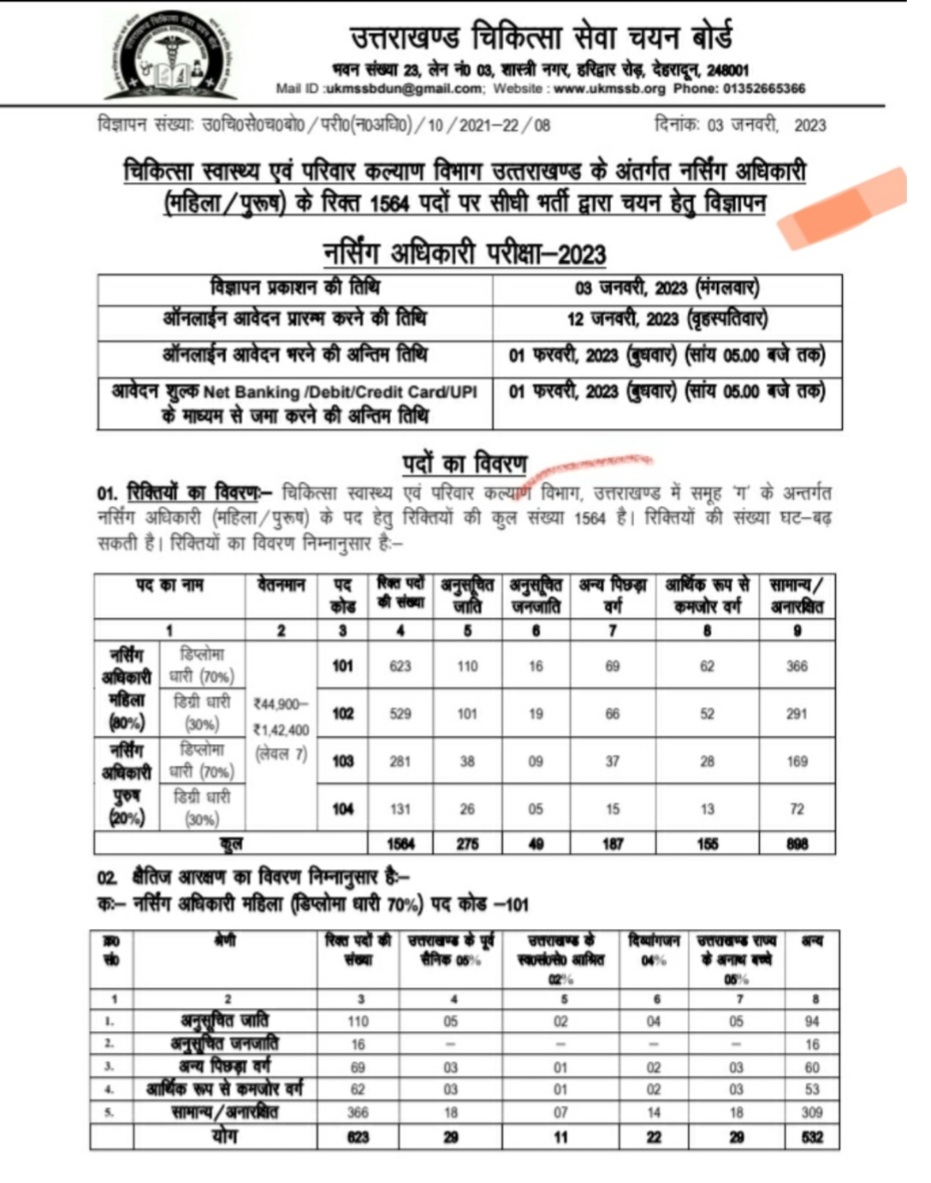 देहरादून-चिकित्सा स्वास्थ्य और परिवार कल्याण विभाग उत्तराखंड के अंतर्गत नर्सिंग अधिकारी के 1564 रिक्त पदों पर विभाग ने भर्ती निकाली है,अधिक जानकारी के लिये देखे विस्तृत विज्ञापन