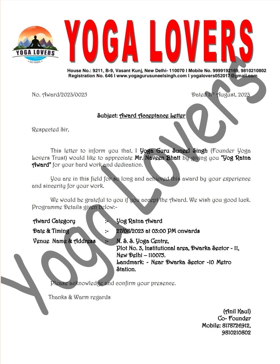 उनके द्वारा योग के क्षेत्र में किये जा रहे उल्लेखनीय कार्यों के लिए दिल्ली के एक सम्मान समारोह में 27 अगस्त को सम्मानित किया जाएगा।योग लवर्स ट्रस्ट द्वारा आयोजित सम्मान समारोह में डॉ नवीन भट्ट को योग रत्न सम्मान से सम्मानित किया जायेगा।सम्मान समारोह में अनेक हस्तियां शामिल होंगी। योग लवर्स ट्रस्ट द्वारा देश भर में उल्लेखनीय कार्य करने वालों को यह सम्मान दिया जाएगा।उत्तराखंड से डॉ नवीन भट्ट का चयन किया गया है।