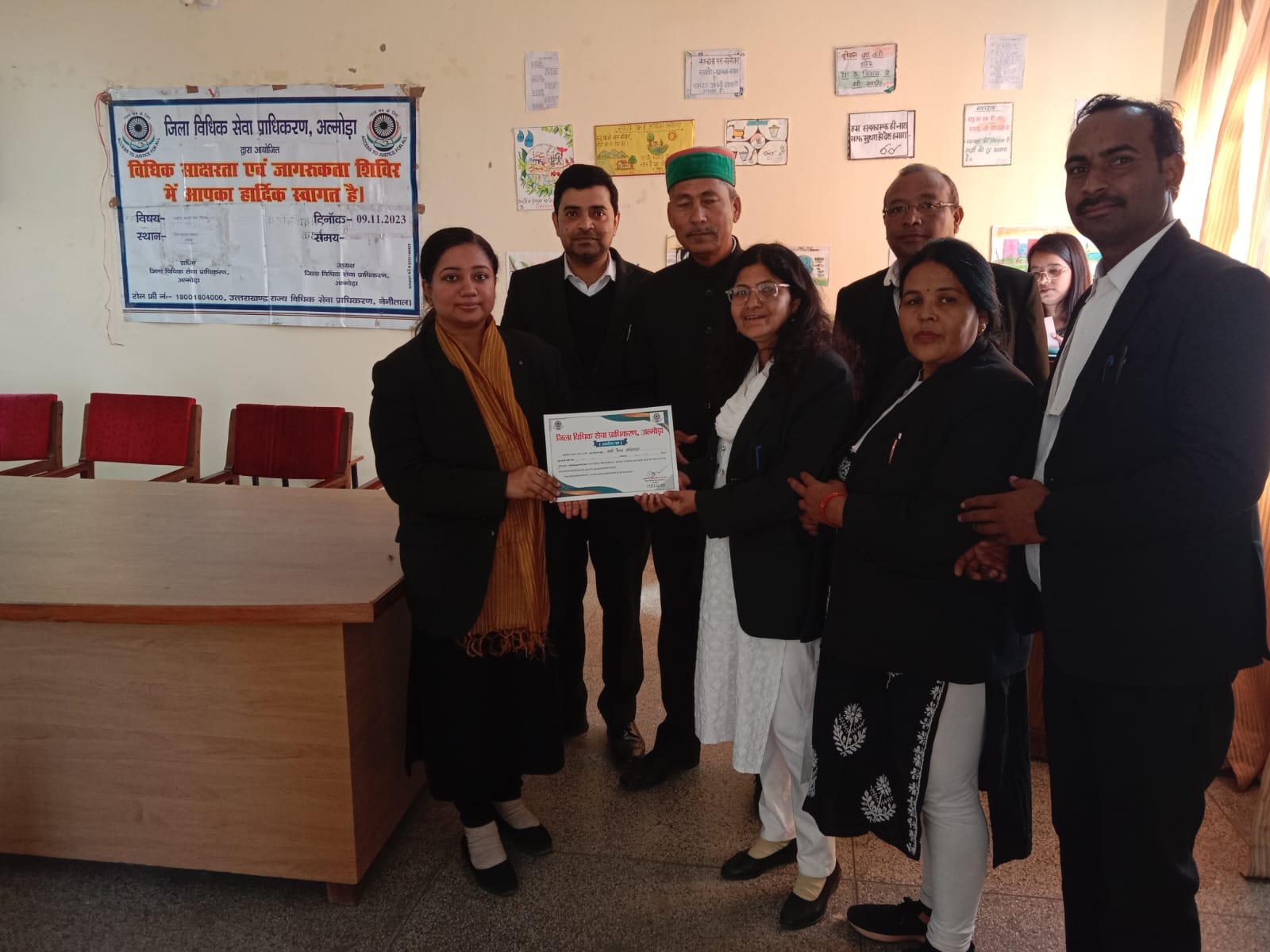 वहीं सचिव ने श्रेष्ठ पैरा लीगल वालिटियर भावना तिवारी व नीता नेगी, जेल पैरा लीगल वालिटियर सुन्दर सिंह रौतेला, जिला विधिक सेवा प्राधिकरण अल्मोड़ा के सभी पैनल अधिवक्तागण व सोबन सिंह जीना परिसर विधि संकाय लीगल एड क्लिनिक व राजकीय इंटर कालेज भिकियासैंण स्थित लीगल लिटिसी क्लब द्वारा विधिक सेवा सम्बंधित कार्यो के निष्पादन में व सभी व्यक्तियों तक विधिक सेवा पहुंचने में उत्कृष्ट सहभागिता निभाने के लिए उन्हें प्रशस्ति पत्र देकर सम्मानित किया गया।