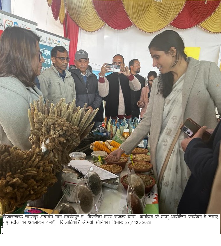 इसी क्रम में आज जनपद विकासखण्ड सहसपुर अन्तर्गत ग्राम भगवंतपुर में जिलाधिकारी सोनिका ने ‘‘विकसित भारत संकल्प यात्रा’’ कार्यक्रम के तहत् आयोजित बहुउद्देशीय शिविर के अन्तर्गत कार्यक्रम स्थल पर लगाए गए विभिन्न विभागों के स्टॉल का निरीक्षण करते हुए आवश्यक दिशा-निर्देश दिए। इस दौरान जिलाधिकारी ने निर्देश दिए हैं कि केन्द्र एवं राज्य सरकार की जनकल्याणकारी योजनाओं का लाभ प्रत्येक व्यक्ति तक पंहुचे इसके लिए शिविर में आने वाले जनमानस से विभिन्न योजनाओं हेतु आवेदन की औपचारिकताएं पूर्ण करवाई जाएं तथा सरकार की योजनाओं से लभान्वित करें तथा जो व्यक्ति योजनाओं से लाभान्वित हो रहे हैं उनसे अन्य लोगों को भी जागरूक करने का अनुरोध किया ताकि अन्य लोग भी सरकार की जनकल्याणाकरी योजनाओं से संतिप्त हो सके।