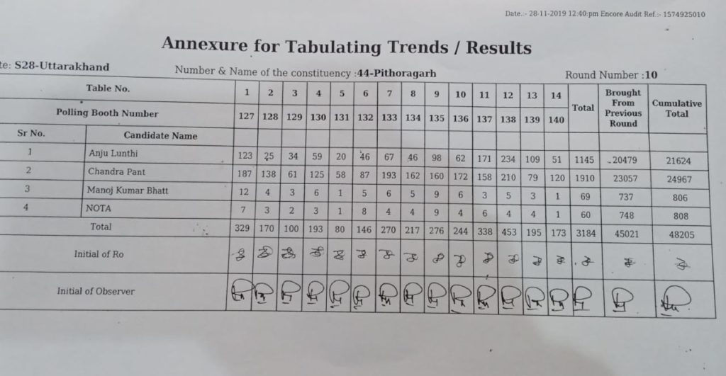 गौतलब है कि निवर्तमान कैबिनेट मंत्री प्रकाश पन्त की मृत्यु के बाद खाली हुई पिथौरागढ़ विधानसभा सीट पर भाजपा आलाकमान ने प्रकाश पन्त की धर्म पत्नी चंद्रा प्रकाश पन्त पर दांव खेला था। वही कांग्रेस के पूर्व विधायक मयूख महर के चुनाव ना लड़ने के निर्णय के बाद इस सीट पर पूर्व ब्लॉक प्रमुख अंजू लुंठी को कांग्रेस ने मैदान पर उतारा था। वही आज हुई मतगणना में पूर्व अनुमान के अनुसार ही चंद्रा प्रकाश पन्त चुनाव जीतने में सफल रही। चुनाव में भाजपा कांग्रेस व सपा प्रत्यासीयो में मतों के आंकड़े कुछ इस प्रकार है
