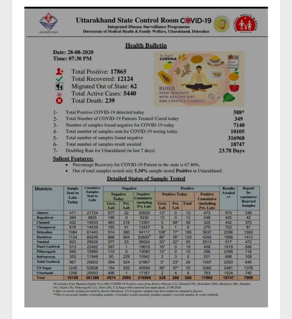 आज अल्मोड़ा जिले में 13 बागेश्वर जिले में 12 मरीजों में कोरोना संक्रमण की पुष्टि हुई है वही चमोली जिले में 58 और चंपावत जिले में 6 लोगों में कोरोना संक्रमण की पुष्टि हुई है आज संक्रमण के लिहाज से देहरादून में सबसे ज्यादा 185 कोरोना संक्रमित मिले हैं वही हरिद्वार जिले में 120 और नैनीताल जिले में 55 लोगों में कोरोना संक्रमण की पुष्टि हुई है और पौड़ी जिले में 18 लोगों में पिथौरागढ़ जिले में 12 लोगों में रुद्रप्रयाग जिले में 5 लोगों में टिहरी गढ़वाल में 26 लोगों में उधम सिंह नगर जिले में 72 और उत्तरकाशी जिले में 6 लोग कोरोना संक्रमण के शिकार हो गए है।