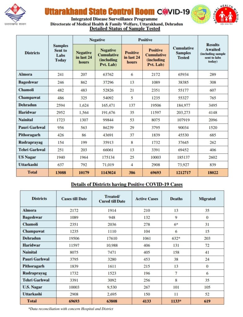 स्वास्थ्य विभाग द्वारा जारी हेल्थ बुलेटिन के अनुसार अल्मोड़ा जिले में आज कोरोना संक्रमण के 6 मामले सामने आए है।वही बागेश्वर जिले में 13 कोरोना संक्रमण केस सामने आये है, चमोली जिले में आज 21 कोरोना केस आये और चम्पावत जिले 5 वही देहरादून जिले में सर्वाधिक 137 और हरिद्वार जिले में 35 नैनीताल जिले में 53 वही पौड़ी जिले में 29 और पिथौरागढ़ जिले में 37 रुद्रप्रयाग जिले में 8 और टिहरी जिले में 13 और उधम सिंह नगर में 25 उत्तरकाशी जिले में 4 मरीजो में कोरोना संक्रमण की पुष्टि हुयी है और अभी तक 619 मरीज इस संक्रमण से ठीक होकर अन्य प्रदेशों में चले गए है।