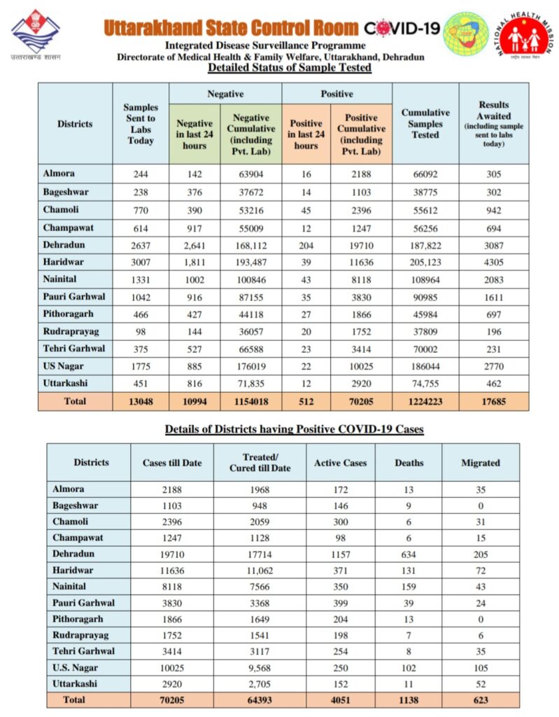 स्वास्थ्य विभाग द्वारा जारी हेल्थ बुलेटिन के अनुसार अल्मोड़ा जिले में आज कोरोना संक्रमण के 16 मामले सामने आए है।वही बागेश्वर जिले में 14 कोरोना संक्रमण केस सामने आये है, चमोली जिले में आज 45 कोरोना केस आये और चम्पावत जिले 12 वही देहरादून जिले में सर्वाधिक 204 और हरिद्वार जिले में 39 नैनीताल जिले में 43 वही पौड़ी जिले में 35 और पिथौरागढ़ जिले में 27 रुद्रप्रयाग जिले में 20 और टिहरी जिले में 23 और उधम सिंह नगर में 22 उत्तरकाशी जिले में 12 मरीजो में कोरोना संक्रमण की पुष्टि हुयी है और अभी तक 623 मरीज इस संक्रमण से ठीक होकर अन्य प्रदेशों में चले गए है।