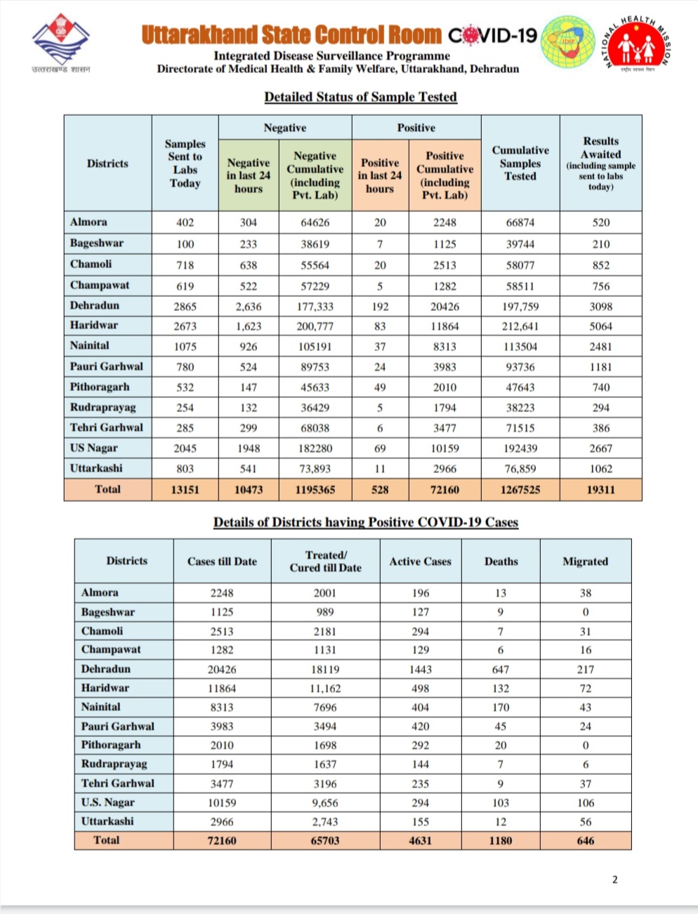 स्वास्थ्य विभाग द्वारा जारी हेल्थ बुलेटिन के अनुसार अल्मोड़ा जिले में आज कोरोना संक्रमण के 20 मामले सामने आए है।वही बागेश्वर जिले में 7 कोरोना संक्रमण केस सामने आये है, चमोली जिले में आज 20 कोरोना केस आये और चम्पावत जिले 5 वही देहरादून जिले में सर्वाधिक 192 और हरिद्वार जिले में 83 नैनीताल जिले में 37 वही पौड़ी जिले में 24 और पिथौरागढ़ जिले में 49 रुद्रप्रयाग जिले में 5 और टिहरी जिले में 6 और उधम सिंह नगर में 69 उत्तरकाशी जिले में 11 मरीजो में कोरोना संक्रमण की पुष्टि हुयी है और अभी तक 646 मरीज इस संक्रमण से ठीक होकर अन्य प्रदेशों में चले गए है।