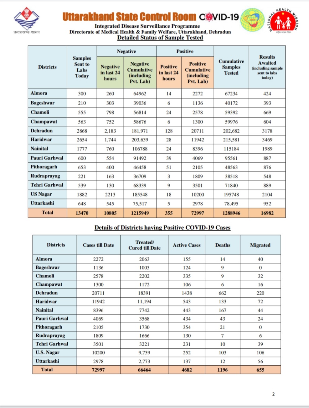 स्वास्थ्य विभाग द्वारा जारी हेल्थ बुलेटिन के अनुसार अल्मोड़ा जिले में आज कोरोना संक्रमण के 14 मामले सामने आए है।वही बागेश्वर जिले में 6 कोरोना संक्रमण केस सामने आये है, चमोली जिले में आज 24 कोरोना केस आये और चम्पावत जिले 6 वही देहरादून जिले में सर्वाधिक 128 और हरिद्वार जिले में 28 नैनीताल जिले में 24 वही पौड़ी जिले में 39 और पिथौरागढ़ जिले में 51 रुद्रप्रयाग जिले में 3 और टिहरी जिले में 9 और उधम सिंह नगर में 18 उत्तरकाशी जिले में 5 मरीजो में कोरोना संक्रमण की पुष्टि हुयी है और अभी तक 655 मरीज इस संक्रमण से ठीक होकर अन्य प्रदेशों में चले गए है।