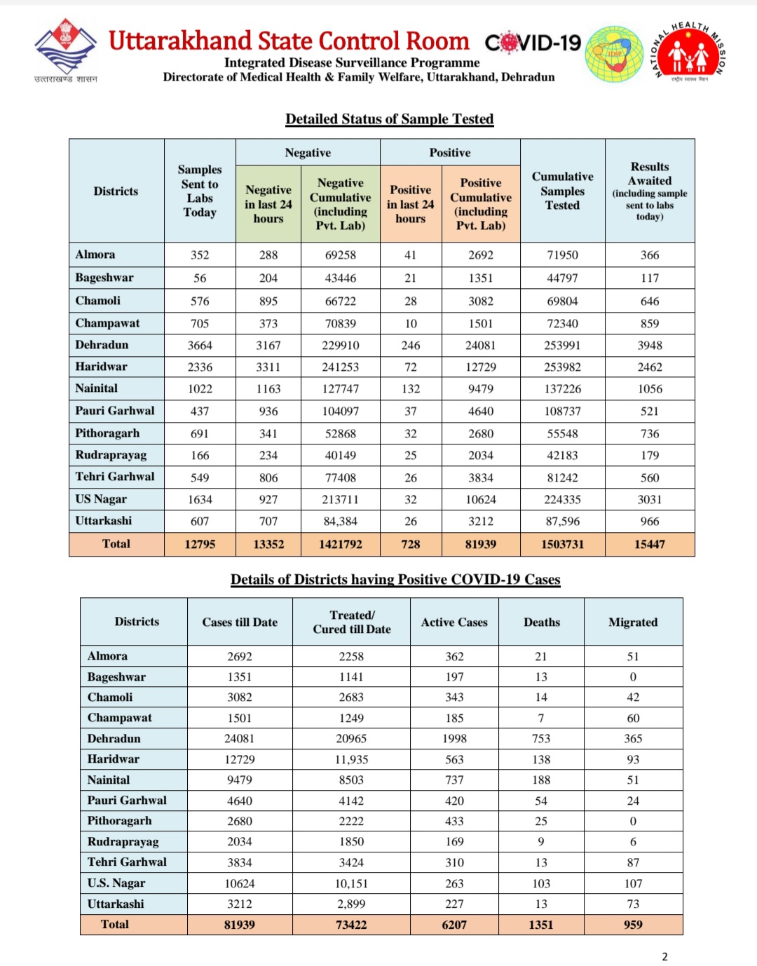 उत्तराखंड में आज 728 मरीजो में कोरोना संक्रमण की पुष्टि, प्रदेश में कोरोना संक्रमितों की संख्या 81939 हजार के पार