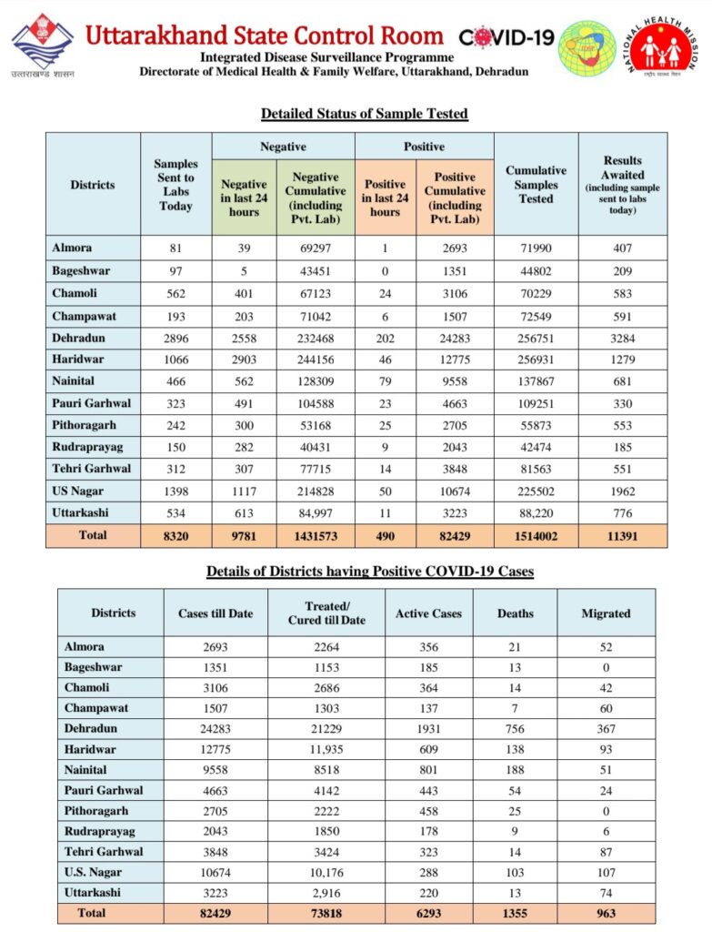 स्वास्थ्य विभाग द्वारा जारी हेल्थ बुलेटिन के अनुसार अल्मोड़ा जिले में आज कोरोना संक्रमण का 1 मामला सामने आया है।वही बागेश्वर जिले में आज एक भी कोरोना संक्रमण का केस नही आया है, चमोली जिले में आज 24 कोरोना केस आये और चम्पावत जिले 6 वही देहरादून जिले में सर्वाधिक 202 और हरिद्वार जिले में 46 नैनीताल जिले में 79 वही पौड़ी जिले में 23 और पिथौरागढ़ जिले में 25 रुद्रप्रयाग जिले में 9 और टिहरी जिले में 14 और उधम सिंह नगर में 50 उत्तरकाशी जिले में 11 मरीजो में कोरोना संक्रमण की पुष्टि हुयी है और अभी तक 963 मरीज इस संक्रमण से ठीक होकर अन्य प्रदेशों में चले गए है।