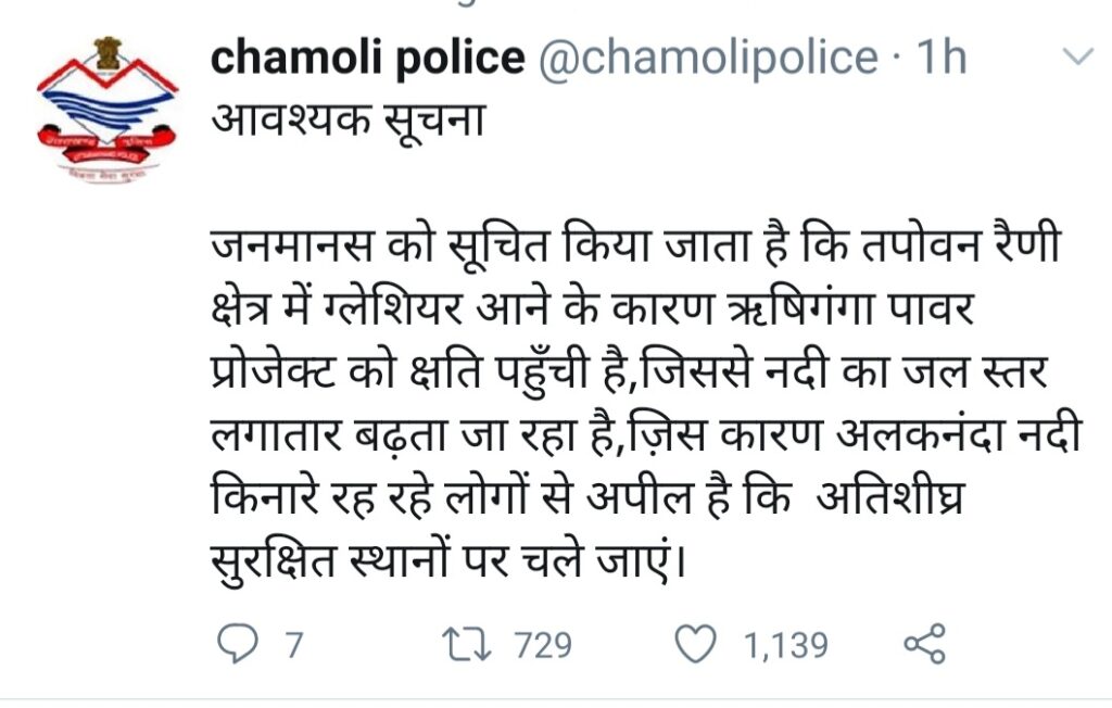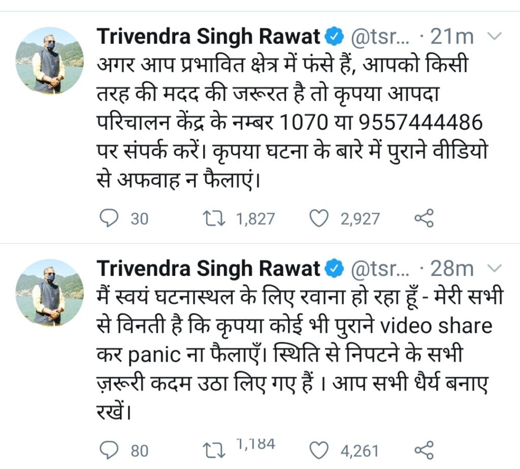 राज्य के मुख्यमंत्री त्रिवेंद्र सिंह रावत ने कहा, “चमोली के रिणी गांव में ऋषिगंगा प्रोजेक्ट को भारी बारिश व अचानक पानी आने से क्षति की संभावना है. नदी में अचानक पाने आने से अलकनंदा के निचले क्षेत्रों में भी बाढ़ की संभावना है. तटीय क्षेत्रों में लोगों को अलर्ट किया गया है. नदी किनारे बसे लोगों को क्षेत्र से हटाया जा रहा है.” मैं स्वयं घटनास्थल के लिए रवाना हो रहा हूं. मेरी सभी से विनती है कि कृपया कोई भी पुराने वीडियो शेयर कर पैनिक ना फैलाएँ. स्थिति से निपटने के सभी ज़रूरी कदम उठा लिए गए हैं .आप सभी धैर्य बनाए रखें।