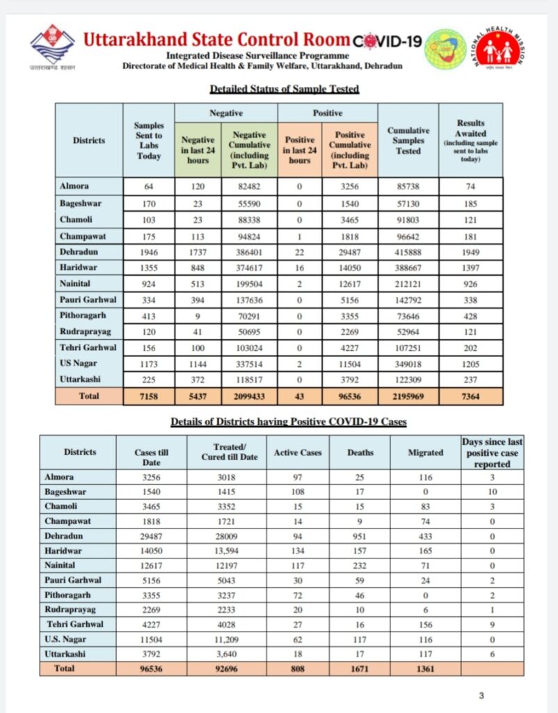 आज 5437 सैम्पल की जांच रिपोर्ट नेगेटिव आयी है वही 7364 सैम्पल्स की जांच अभी प्रतीक्षारत है और आज 7158 सैम्पल्स जांच को भेजे गए है वर्तमान के कोरोना की रिकवरी रेट 96 प्रतिशत है और अभी तक इस महामारी से 1671 मरीजो की मौत हो गई है।