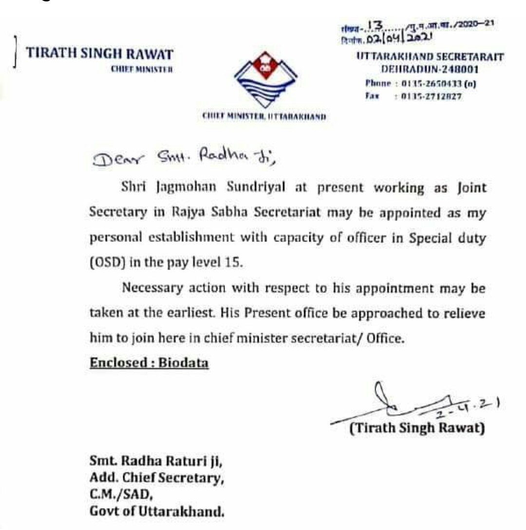 राज्यसभा सचिवालय में संयुक्त सचिव के तौर पर काम कर रहे जगमोहन सुंदरियाल अब मुख्यमंत्री तीरथ सिंह रावत के ओएसडी (ऑफिसर इन स्पेशल ड्यूटी) होंगे। प्रदेश में मुखिया के बदलने के बाद धीरे धीरे टीम भी बदल रही है और अब मुख्यमंत्री तीरथ सिंह रावत नई टीम के साथ काम कर रहे हैं कयास लगाए जा रहे है कि आने वाले समय में और फेरबदल किये जायेंगे।मुख्यमंत्री ने कुछ समय पूर्व ही दायित्व धारियों की छुटटी कर दी थी अब माना जा रहा है कि जल्द ही नए दायित्व धारी और नए सलाहकार की नियुक्तियां भी की जाएंगी।